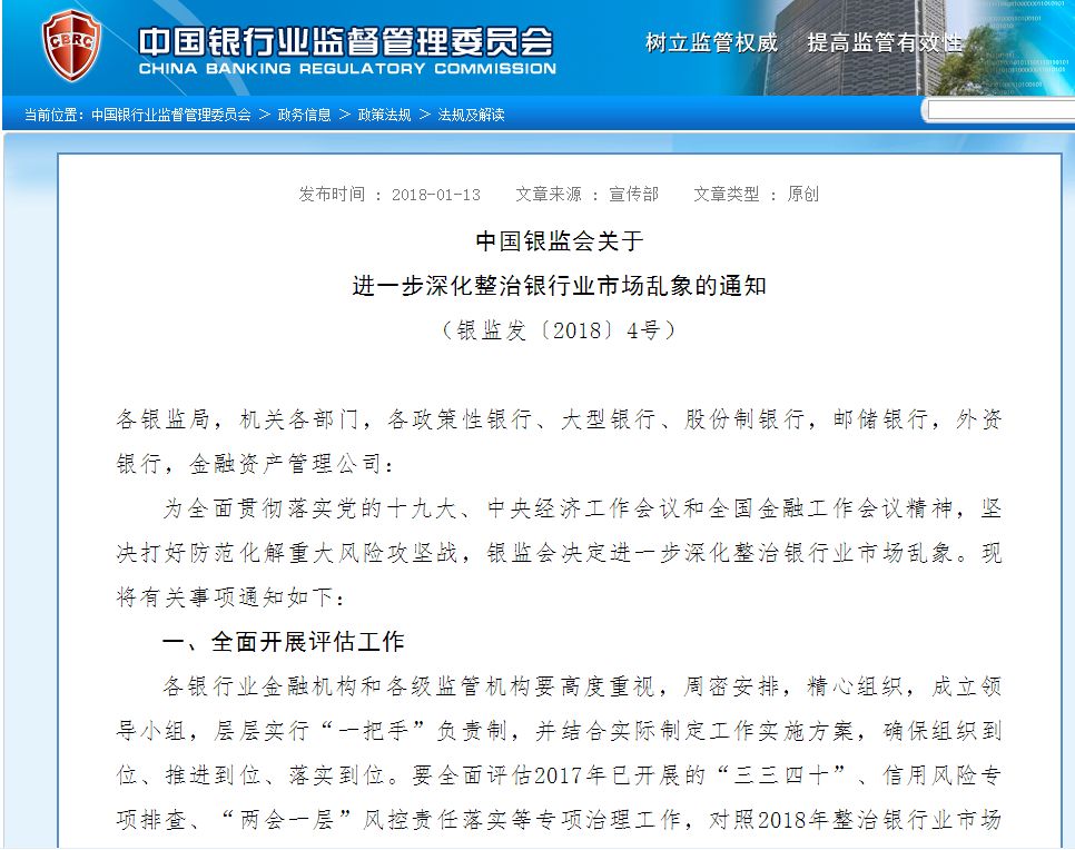 2018年1月,银监会决定进一步深化整治银行业市场乱象,印发《关于进一步深化整治银行业市场乱象的通知》,要求持续保持银行业监管高压态势,严肃惩处违法违规行为。