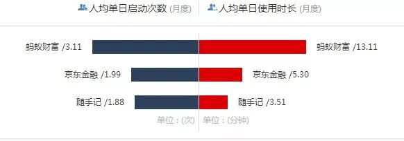 蚂蚁财富主要的投资产品是基金,其高波动性决定了用户的启动驱动因素较强,人均启动次数和人均使用时长都明显较高,随手记和京东金融在用户粘性方面差距不大,京东金融主要以用户购物流量带动金融消费,随手记则以用户记账行为提高用户粘性,在提高用户转化的进程中,仍有进一步开发的空间。