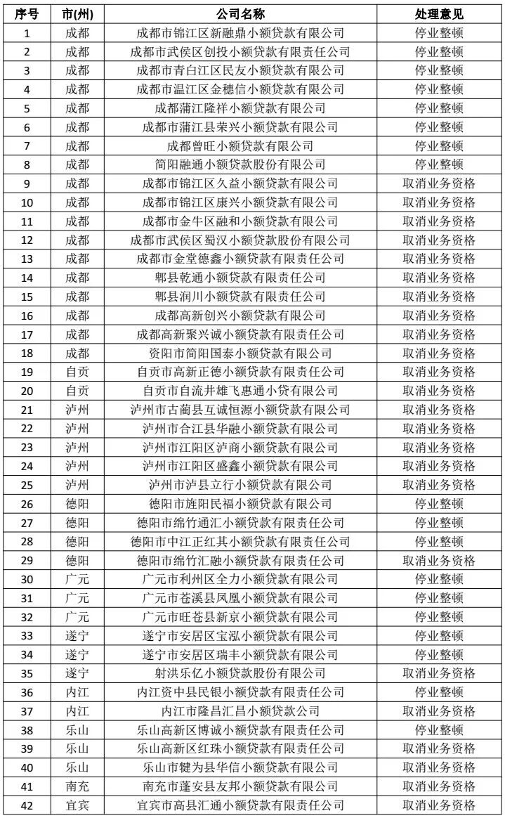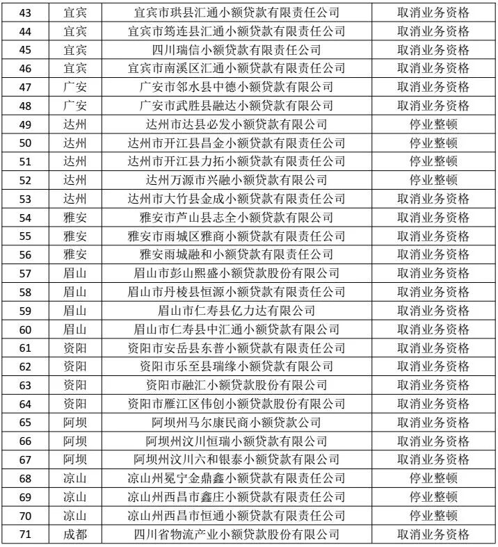 附四川71家小贷公司整顿名单