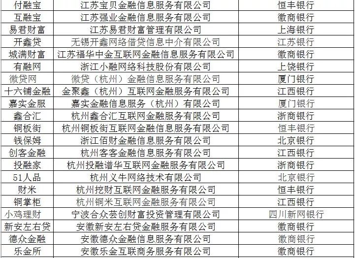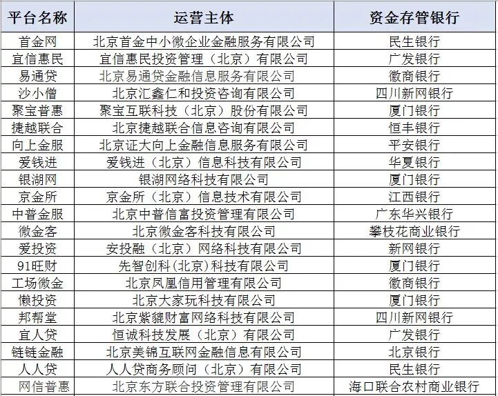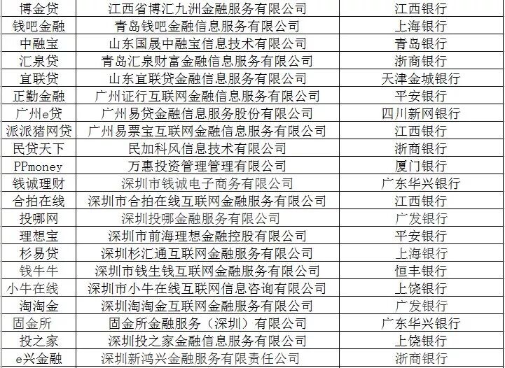 这23家平台机构分别是:沙小僧、聚宝普惠、懒投资、网信普惠、小油菜、爱钱帮、安润金融、金信网、小存折、鼎盛盈通、房金所、米缸金融、翼勋、城满财富、鑫合汇、钱保姆、铜掌柜、新安左右贷、汇泉贷、淘淘金、固金所、壹佰金融、宝点网。