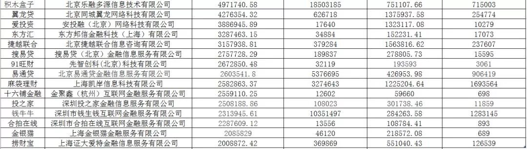 在借贷余额方面,超过300亿元的平台共有5家,陆金服、玖富普惠、宜人贷、宜信惠民、爱钱进的借贷余额分别为945.4亿元、527.1亿元、471.8亿元、389.8亿元、341.4亿元。
