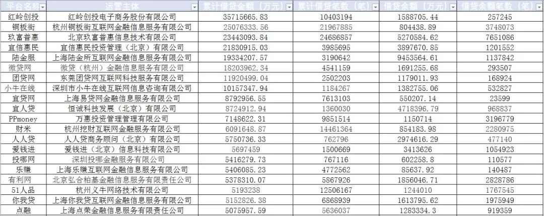 而在公布的93家平台运营数据中,截至4月30日,累计借贷金额超过200亿元的共有35家,其中红岭创投、铜板街、玖富普惠分别以3571.5亿元、2507.6亿元、2344.3亿元成为累计借贷金额最多的平台。