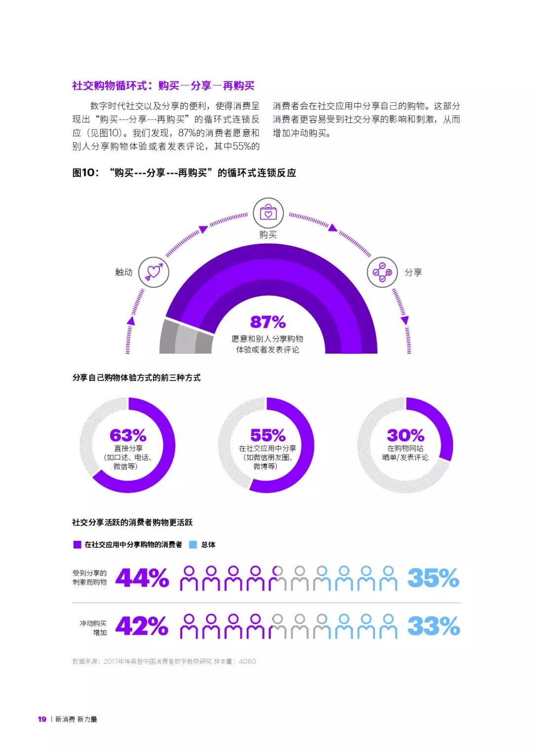 此外,87%的消费者愿意和别人分享购物体验或者发表评论,其中55%的消费者会在社交应用中分享自己的购物。这部分消费者更容易受到社交分享的影响和刺激,从而增加冲动购买,使消费呈现出“购买—分享—再购买”的循环式连锁反应。