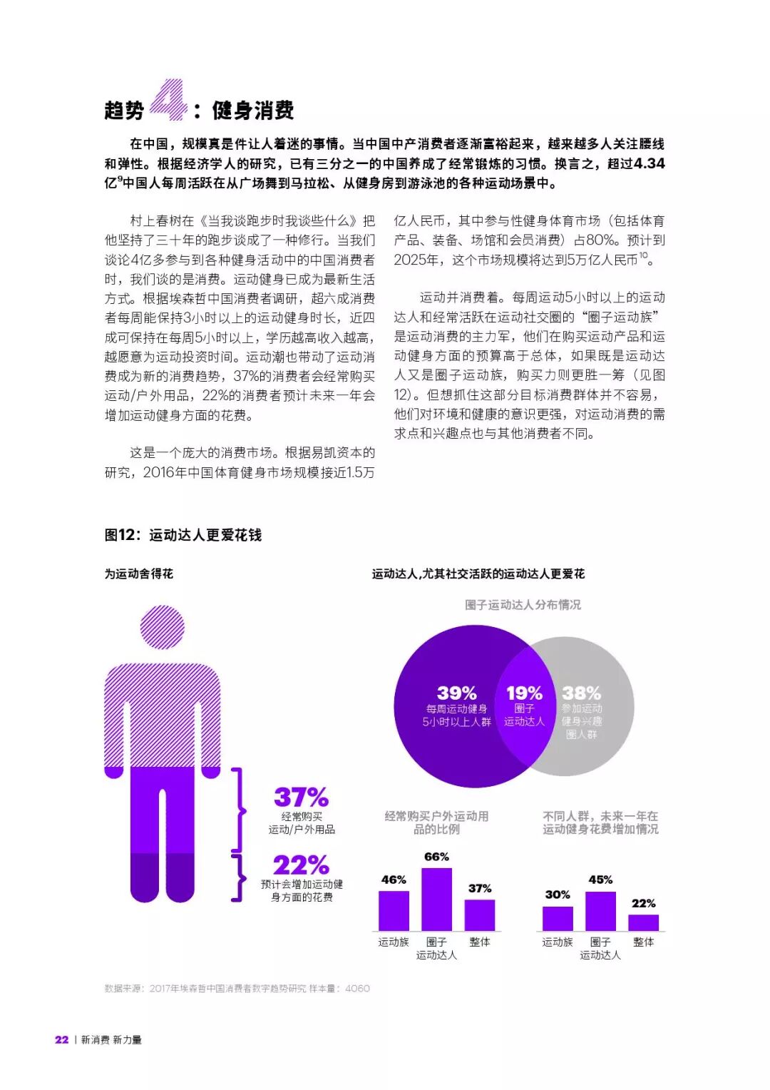 运动健身已成为最新生活方式,并孕育着庞大的消费市场——运动并消费着,正成为中国消费新趋势。每周运动5小时以上的运动达人和经常活跃在运动社交圈的“圈子运动族”是运动消费的主力军,他们在购买运动产品和运动健身方面的预算很高;如果既是运动达人又是圈子运动圈,购买力则更胜一筹。