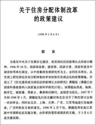 1996年6月我在厉以宁教授(时任全国人大法律委副主任委员)指导下完成了博士论文,研究方向就是由董辅礽教授(时任全国人大财经委副主任委员)所提出的《现代化进程中房地产业理论与实践的比较研究》,包括各国住房制度改革比较的章节。随后由国家建设部、国家体改委、国家计委、国家科委和中房集团共同设立起一个课题组,启动了住房建设成为国民经济新增长点研究与住房制度改革方案设计。这个房改课题组由杨慎、洪虎、郑新立、尚勇等人担任顾问,由我担任课题组组长,成员中包括梁运斌、印坤华、高材林等专家。方案设计中大量采用了厉以宁、董辅礽所指导的我的博士论文内容,可以说这个课题组汇集了当时中国的顶级专家和顶级智慧。房改课题组从1996年10月开始工作,到北京、上海、广东、江苏等多地进行调研。到1998年3月完成课题报告,历时一年半。