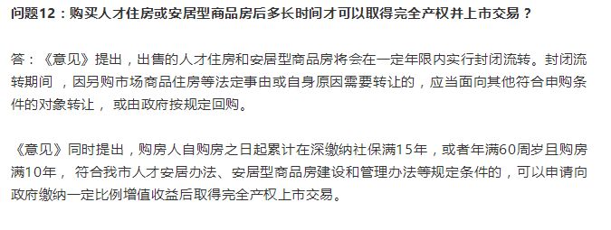 大招终于落地。 就在刚刚,深圳住建局在新闻通报会上发布了 《关于深化住房制度改革加快建立多主体供给多渠道保障租购并举的住房供应与保障体系的意见(征求意见稿)》。 从住建局这次推出的若干深化住房制度改革的举措来看,深圳对优质人才予以了高度倾斜,首先就是要人才安居的问题。 这份意见稿明确了深圳未来18年的住房发展目标。文件中指出,2018年至2035年,深圳将新增住房170万套,其中人才住房、安居型商品房和公共租赁住房占总量60%左右,总量不少于100万套。 以下是详细解读+政策全文。 资料整理自:深圳新浪房产、南方日报 硬性供应指标 深圳政府第一件事就是重塑整个住房供应体系,确立租购并举下,各类住产的硬性供应指标: 1、市场商品住房,占住房供应总量的40%左右。 2、人才住房,占住房供应总量的20%左右,建筑面积以小于90平方米为主,租金、售价分别为届时同地段市场商品住房租金、售价的60%左右。 3、安居型商品房,占住房供应总量的20%左右,建筑面积以小于70平方米为主,租金、售价分别为届时同地段市场商品住房租金、售价的50%左右。 4、公共租赁住房,占住房供应总量的20%左右,面向符合条件的户籍中低收入居民,建筑面积以30—60平方米为主,只租不售,租金为届时同地段市场商品住房租金的30%左右,特困人员及低保、低保边缘家庭租金为公共租赁住房租金的10%。 八大供应主体 以房地产开发企业为主,提供市场商品住房、安居型商品房。 以住房租赁经营机构为主,提供各类长租公寓。 以市、区政府为主,提供人才住房、安居型商品房和公共租赁住房。 以人才住房专营机构为主,建设筹集人才住房、安居型商品房和公共租赁住房。 支持社区股份合作公司和原村民,通过“城中村”综合整治和改造,提供各类符合规定的租赁住房。 支持企事业单位利用符合规定的自有用地或自有用房,建设筹集人才住房、安居型商品房和公共租赁住房。 支持各类金融机构,采取直接投资、融资等方式,建设筹集人才住房、安居型商品房和公共租赁住房。 支持社会组织等各类主体,建设筹集具有公益性质的各类住房。 六大渠道保障 1.增加建设用地,实施以公共交通为导向的住房开发模式,突出产城融合、职住平衡,在宝安、龙岗、龙华、坪山、光明和深汕特别合作区等区域建设大型安居社区。 2.盘活存量用地,加大棚户区改造力度,推进已批未建用地、社会存量用地、未完善征(转)手续用地、征地返还用地等开发建设保障性住房。 3.利用招拍挂商品住房用地、城市更新和产业园区等配建保障性住房。 4.盘活各类存量用房,推进社会存量住房租购。 5.实施公共设施综合开发,通过轨道交通车辆段和停车场、公交场站等城市基础设施和公共配套设施等综合开发建设保障性住房。 6.开展城际合作,落实粤港澳大湾区战略,推动建立都市圈城际住房合作机制,结合轨道交通和产业布局,在临深片区开发建设保障性住房。 货币补贴 面向符合条件的基本住房保障对象发放住房租赁补贴。 面向符合条件的人才发放人才安居补贴。 面向符合条件的人才实施购房贷款贴息。 探索采用住房租赁券的形式发放住房租赁补贴和人才安居补贴。 九大主要措施 九大主要措施:房地产调控继续,安居型商品房封闭流转制度 一、完善住房规划和用地供应机制 从2018年起,在新增居住用地中,确保人才住房、安居型商品房和公共租赁住房用地比例不低于60%,同时在新出让居住用地中提高“只租不售”用地比例。实行轨道交通车辆段上盖及其站点一定范围内的居住用地用途控制,主要用于建设人才住房、安居型商品房和公共租赁住房。 二、强化基本住房保障 三、全面实施人才安居工程 符合条件的高层次人才可以申请在一定年限内免租入住相应面积标准的住房;在深全职工作满5年以上、符合条件的可以按优惠政策购买人才住房或者申请获赠住房产权。 四、完善安居型商品房制度 完善安居型商品房的分配制度,实行批次集中配租配售,根据每批房源的供应情况,综合考虑申请人在深缴纳社保时间等因素设定入围条件,以轮候、抽签、摇号等公开透明的方式确定租售对象。 五、建立人才住房和安居型商品房封闭流转制度 购房人自购房之日起累计在深缴纳社保满15年,或者年满60周岁且购房满10年,符合我市人才安居办法、安居型商品房建设和管理办法等规定条件的,可以进入市场流转,但要向政府缴纳一定比例的增值收益。 六、大力发展住房租赁市场 鼓励发展长期租赁,支持房地产开发企业、金融保险机构、房地产经纪机构、物业服务企业等拓展住房租赁业务,调动各类主体建设筹集租赁住房的积极性,多渠道增加租赁住房。 七、促进房地产市场平稳健康发展 优化市场商品住房供应户型结构,加大中小户型普通商品住房供应。正确引导居民住房消费观念,保障合理自住需求,抑制投资投机性行为。保持房地产调控政策的连续性、稳定性,严格落实各项调控措施。规范房地产市场秩序,坚决查处开发、销售、交易、中介等环节的违法违规行为。 八、加强人才住房、安居型商品房和公共租赁住房分配管理 九、加大住房货币补贴和住房金融创新力度 住房租赁补贴、人才安居补贴等货币补贴纳入市、区财政预算。深化住房公积金制度改革,探索建立住宅政策性金融机构,为