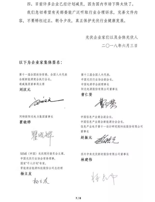 6月3日,11名光伏大佬致信新华社,发表“关于企业家对三部委出台531光伏新政的紧急诉求 ”的联名信。