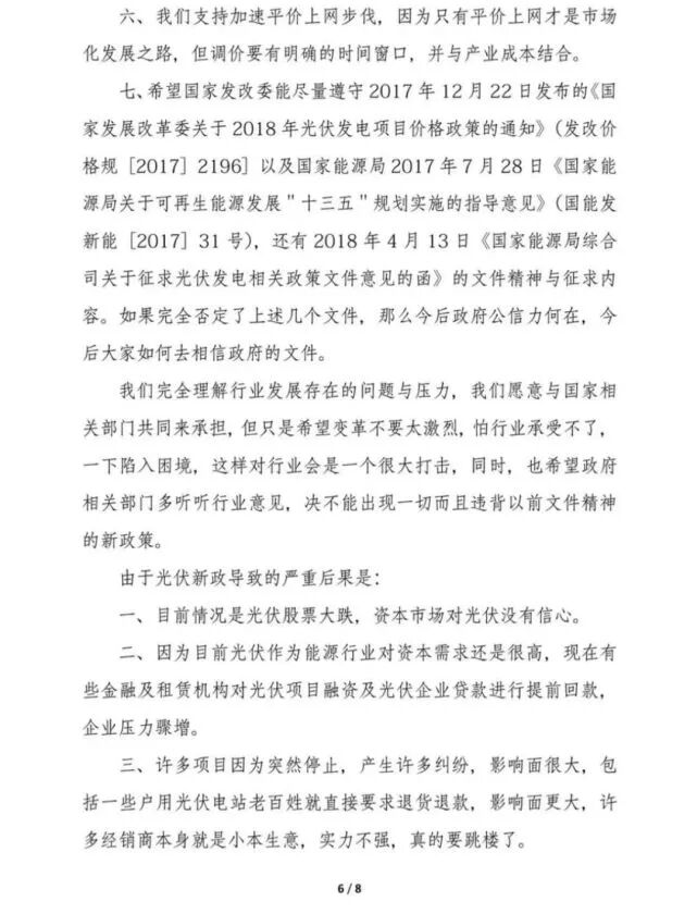 七、希望国家发改委能尽量遵守2017年12月22日发布的《国家发展改革委关于2018年光伏发电项目价格政策的通知》(发改价格规[2017] 2196]以及国家能源局2017年7月28日《国家能源局关于可再生能源发展"十三五”规划实施的指导意见》(国能发新能[2017] 31号),还有2018年4月13日《国家能源局综合司关于征求光伏发电相关政策文件意见的函》的文件精神与征求内容。如果完全否定了上述几个文件,那么今后政府公信力何在,今后大家如何去相信政府的文件。