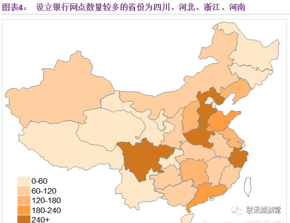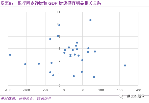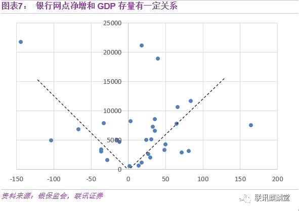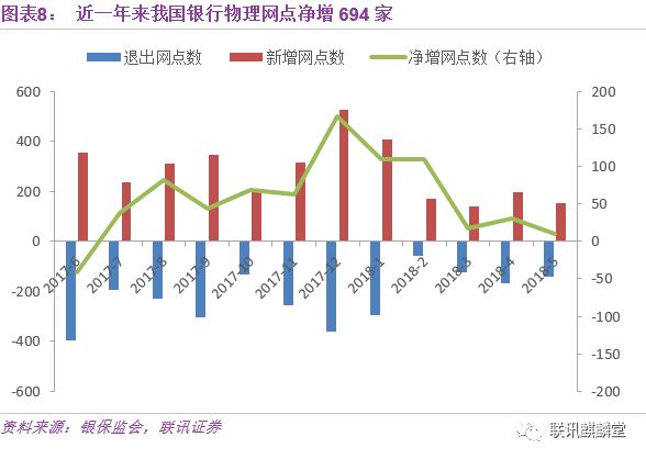 (一)呈现净新增减少的趋势,网点调整和转型是长期趋势 我国银行物理网点众多,据银保监会金融许可证查询,截止2018年5月28日,登记在册的全国物理网点228828家。从空间上看,全国银行物理网点主要集中于东部、中部及东北部。 东部地区除面积较小的直辖市及海南省以外,其余大部分网点数量在12000家以上。中部地区网点数量均在6000家以上,河南网点数量为13027家。东北地区除吉林省以外,其余两省网点数量在6000家以上。西部地区除四川省、陕西省及广西省以外,其余省份银行物理网点数量均在6000家以下。 资料来源:银保监会、联讯证券 但是随着AI的快速发展,AI取代人力,电子银行取代物理网点的呼声越来越高,就如悬在银行物理网点头上的“达摩克利斯之剑”,尤其在互联网第三方支付、网络银行等的夹击下日渐凋零,越来越多的银行物理网点关闭。据统计,近两年机构退出主要分布于东部、中部及东北部。 资料来源:银保监会、联讯证券 但是只看退出的网点数还不能代表银行网点的总体趋势,结合新设网点来看,从2017年5月31日至2018年5月28日,近一年来在全国设立的银行网点3370家,高于近一年关闭的银行网点数,在空间上较为分散,设立银行网点数量较多的省份为四川、河北、浙江、河南。 资料来源:银保监会、联讯证券 从上述图【3】和图【4】可以看出,我国银行网点退出数目多的省份一般也是新增数目多的,集中在四川、河北、浙江、河南、山东、辽宁和广东这些地方,可见,银行网点“关停潮”表象下,其实是银行网点的结构性转型。 那用新增减去退出代表网点净增情况,我国银行网点净增情况有什么规律呢?还是用2017年5月到2018年5月28日近一年时间的银行网点净增数据来看,单看净增情况,全国各地的数据差别就没那么大了,净增最多的是河北省(165家),净退出最多的是广东省,退出144个,其他大部分省份都分布在净退出30家到净增加90家之间。 资料来源:银保监会、联讯证券 为了进一步了解银行网点的增减与当地经济的关系,验证增设网点是不是为支持地方实体发展,我们以银行网点变动为横轴,GDP累计同比和累计值为纵轴分别观察各省银行网点增减与GDP增速之间、与GDP存量之间的规律性。 发现GDP体量越大的省银行网点变动越大,并且存在两种极端,要么增加较多,要么减少较多,GDP体量较小的银行网点变动比较平稳,既无大增也无大减。 GDP体量较大的部分省银行网点数量大减是一种市场出清现象,这种现象在广东、北京、天津和上海四大省级经济单位都有体现。另外一种GDP体量较大的省份银行网点数量大增,比如河北、浙江、山西等,这些省份中新增的银行网点与经济增速没有明显相关的关系,但是和经济体量有关,说明大部分银行的扩张还是在以经济存量而不是经济增量为基准,银行网点的扩张似乎并不是以服务新增经济为直接目的,而是一种服务存量经济的补充行为。 根据时间来看我国各省的网点数量变化情况如图【8】所示,从2017年6月1日至2018年5月28日,我国银行物理网点净增694家,17年12月净增规模最大是167家。 这样来看,虽然近一年银行裁撤网点数量增加,但新增网点的数量同样在增加,整体上我国银行的物理网点数目还是呈现上升趋势的,不过2018年以后增速开始放缓,所以银行“关停潮”的说法有些言之过早,但是截至目前从网点数目的趋势上来看未来确实存在这种可能。 这种银行物理网点规模合理吗?从国外的经验数据来看,一方面利率市场化改革将导致银行业整体利润水平在短时间内出现大幅下滑,行业竞争加剧。网点作为银行最为“昂贵”的渠道资源,能否实现有效回报将决定银行的整体绩效水平,作为网点主要功能的吸储,这些年来已经呈现下降趋势,根据wind数据显示2017年我国上市银行吸收存款的能力明显下降,26家A股上市银行吸收存款的增长率从2016年的10.3%变为2017年的6.1%。 另外一方面,网点租金和人工成本上涨、硬件维护成本和设备更新投资需求也在竞争的压力下大幅度“被动”上升,进一步加大了网点的盈利压力。根据wind数据显示,我国26家A股上市银行的应付职工薪酬从2015年开始一直居高不下,总规模在3亿左右,提升网点渠道整体投资回报率以及单点的经营效率将成为银行关注的核心问题。 与美国对比,从数目上来看,根据世界银行数据显示,2016年,美国每十万人口有32家银行网点覆盖,每一万平方公里约有100家银行物理网点。而目前中国每十万人口有16家银行网点覆盖,每一万平方公里约有236家银行物理网点。虽然从人数上看美国的人均银行覆盖率约为中国的两倍,但从空间上看中国物理网点的覆盖率约为美国的2.36倍,这种现象最直接的体现就是从空间上看,中国的银行的密度比美国高,但是因为人口密度更高于银行密度,所以人均网点数反而更少。 从变化率上来看,利率市场化后银行将会更积极的进行网点布局和数量调整,网点小型化、专业化,以及不同银行对物理渠道的差异化定位和发展策略等情况都会出现。 根据美国联邦储蓄保险集团的数据,2010~2015年,全美银行网点总数量下降了超过6%,其中花旗银行的网点数量削减了22.7%,美国银行减少了19.5%,第一资本银行减少了15.2%。 综上来看,虽然目前我国银行网点数目增值上还没有下降,但是增速已经趋缓,开始呈现下降趋势,再加上利率市场化进程的加快,银行网点的调整和转