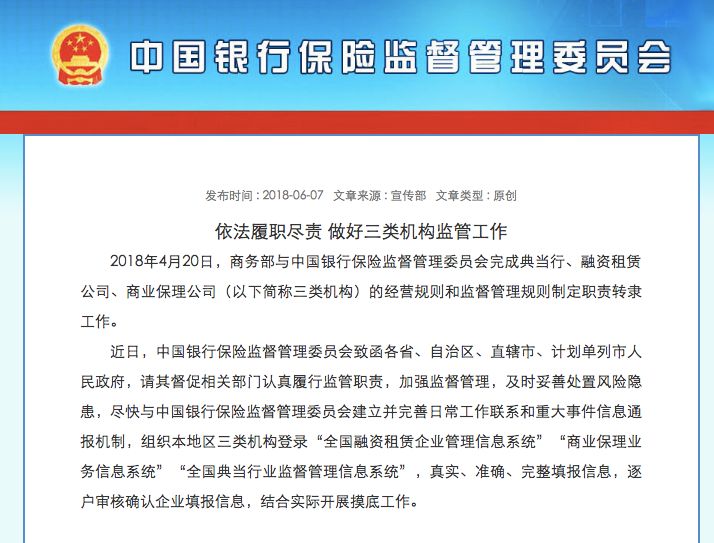 近日,中国银行保险监督管理委员会致函各省、自治区、直辖市、计划单列市人民政府,请其督促相关部门认真履行监管职责,加强监督管理,及时妥善处置风险隐患,尽快与中国银行保险监督管理委员会建立并完善日常工作联系和重大事件信息通报机制,组织本地区三类机构登录“全国融资租赁企业管理信息系统”“商业保理业务信息系统”“全国典当行业监督管理信息系统”,真实、准确、完整填报信息,逐户审核确认企业填报信息,结合实际开展摸底工作。