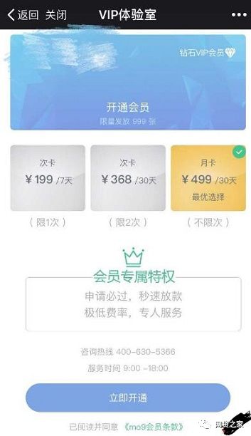 监管层在函件中也提及部分平台在贷款过程中搭售其他商品,变相抬高利率,并直接点名mo9信用钱包和甲鼎速贷,其中mo9信用钱包为现金贷平台,是由上海佰晟通信息科技有限公司运营,目前提供7-14天短期借款,最高可借2000元,但据其客服介绍,在贷款之前需先到其公众号mo9金融中心购买会员后才能借款,一旦购买会员之后,则意味审核必过,一定能下款。