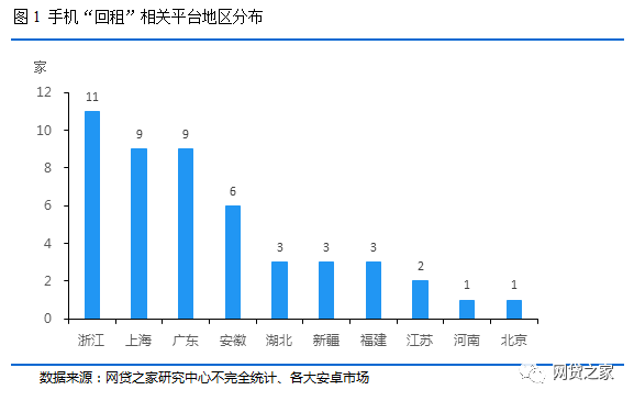 如下图所示,手机“回租”相关平台主要分布在浙江、上海、广东3个地区,其中浙江平台数量最多,有11家平台,其次上海和广东分别有9家平台,安徽地区也有6家平台。