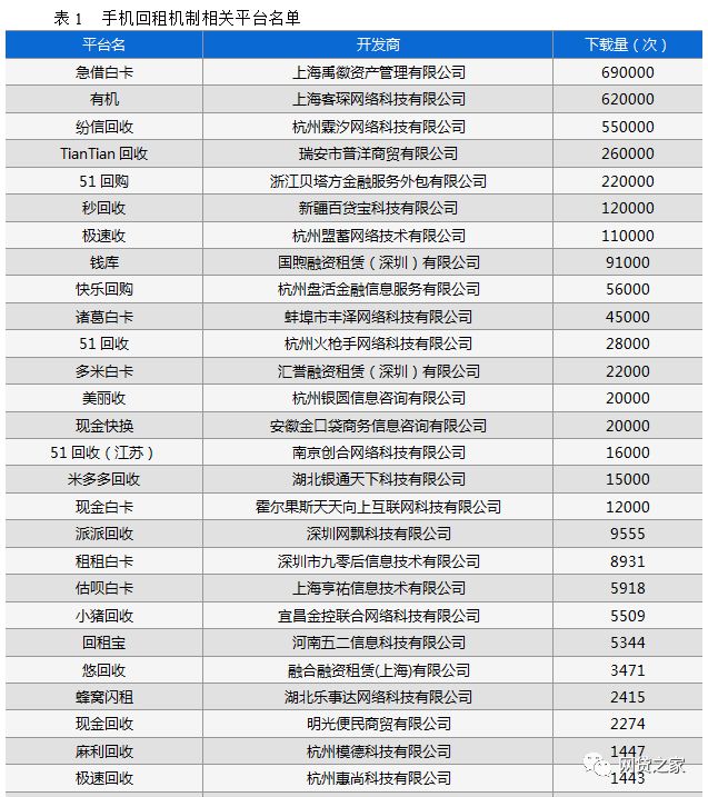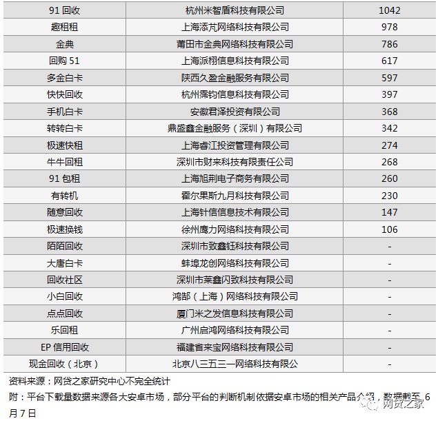 网贷之家通过“回租”、“回购”、“回收”、“手机贷”等关键词,搜索应用宝、百度手机助手、360手机助手等安卓应用市场,并根据相关平台是否审核完成后立即打款,再由用户寄回手机作为原则进行筛选,统计出49家平台,如下表所示: