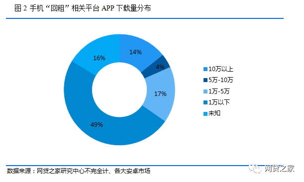 85%的手机“回租”相关平台APP下载量相对较小。如下图所示,手机“回租”相关平台APP下载量大都在1万以下,占比49%;下载量在10万以上的平台数量较少,占比14%,在5万-10万的数量仅占比4%。从下载量数据来看,平台的用户数量较小,从而也可判断出整体手机“回租”的发展规模不大。