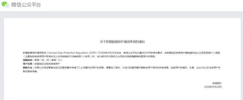 据悉,微软,Facebook、苹果等公司开始修改其在欧盟境内对于用户个人数据的处理方式,在我国,腾讯也在微信公众平台发布《关于欧盟数据保护通用条例的通知》,声明为遵守GDPR的相关要求,当欧盟地区微信用户撤销授权该公众号获取其个人信息(主要包括该微信用户取消关注公众号或其自行注销微信个人帐号)时,会以邮件形式告知公众号的注册邮箱删除欧盟用户的信息。