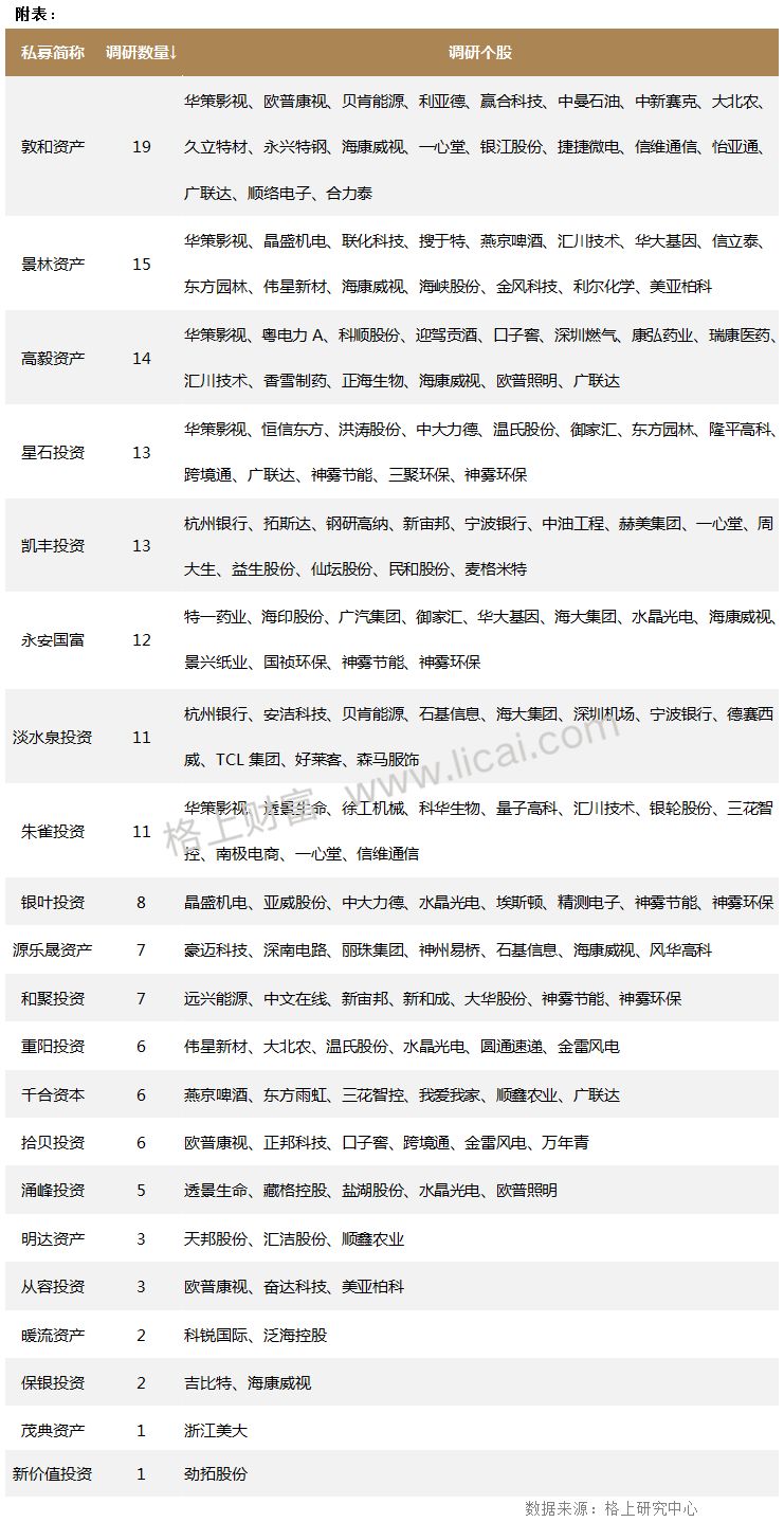 本月,百亿私募同样显示出调研热情,全月共参与调研166次,涉及上市公司115家,调研次数环比上月增长286%。在调研次数上,敦和资产为本月调研最多的百亿私募,共调研19家上市公司,紧随其后的是景林资产,共调研15家上市公司。