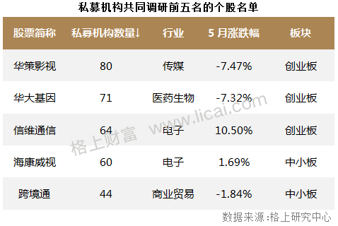 除华策影视外,5月另外4家受私募关注的上市公司分别是华大基因、信维通信、海康威视、跨境通,分别分布在医药生物、电子、商业贸易行业。5月受关注的华大基因是一家生物科技公司,主营业务为提供基因组学类的诊断和研究服务。今年以来公司股价跌幅超30%市值大幅缩水,但5月频频与各地政府合作推出基因相关项目,或引起机构调研兴趣。机构调研者主要关注公司技术发展、国际竞争优势及数据安全限制等问题。