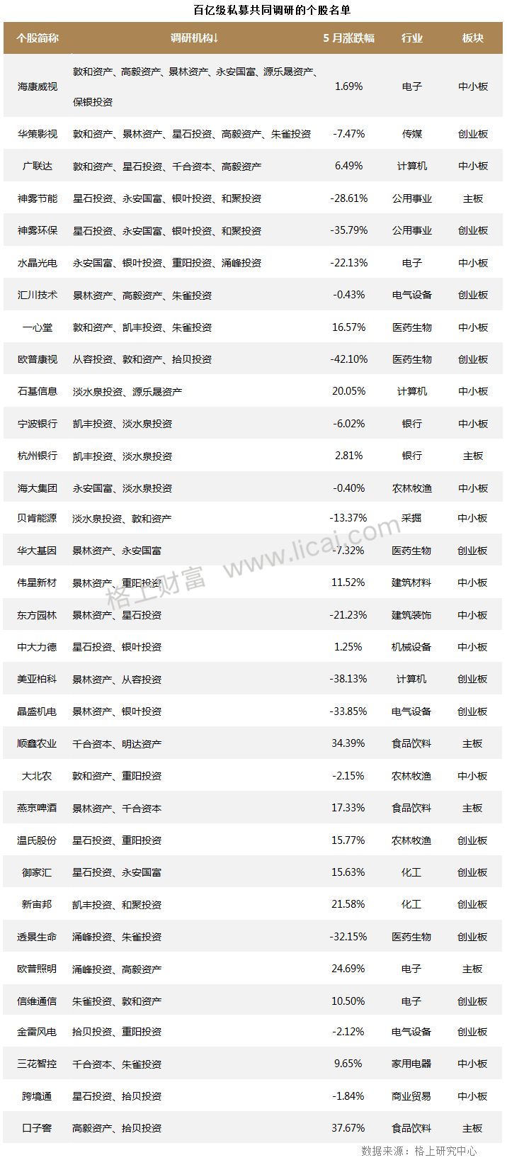 格上研究中心数据显示,本月两家及以上百亿私募共同调研的上市公司有33家,其中5月涨幅最高的是“口子窖”(37.67%),跌幅最大的是“欧普康视”(-42.10%)。最受百亿私募关注的上市公司是“海康威视”,本月不仅获得6家百亿私募关注,更有景林资产的明星基金经理高云程和蒋彤亲自调研。
