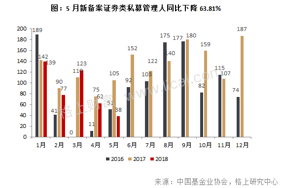 据基金业协会最新数据显示,今年5月份新备案私募管理人160家,其中证券类私募管理人38家,同比下降63.81%,且与上月相比下降幅度达38.71%。5月无新成立的证券类私募管理人备案。