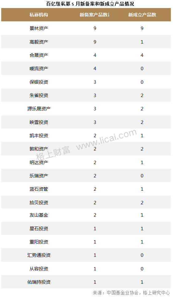 5月共20家百亿级私募新备案产品57只,新备案产品数连续两月下降