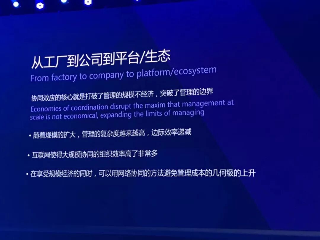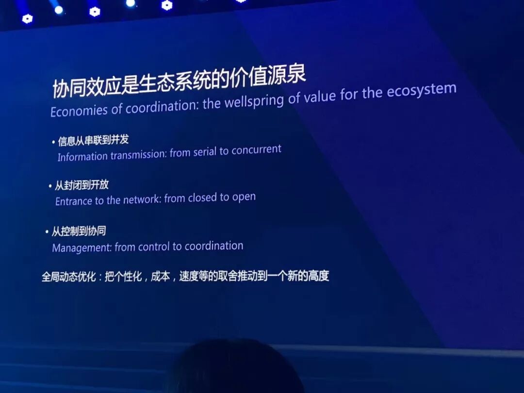我先定义一下协同效应是什么?协同效应的本质是相对于工业时代比较传统的,封闭的线性的供应链管理体制,整个社会用一种多角色、大规模、实时的社会化协同的方式,基于网络来创造新的价值。这种价值创造,就是协同效应。过去两年,我一直在提智能商业,商业的未来就是智能商业。而智能商业有两个核心的组成部分,我把他叫做网络协同和数据智能。那么网络协同就是用社会化分工和合作的方法,他是一种新的创新机制,他创造的核心价值就是协同效应。而他所形成的协同网络就是大家现在经常讲到的生态。我们一直在讲生态是未来最有价值的一种生存方式,平台是生态中最有价值的一个组织。但是,什么是生态,其实以前一直没有人定义过。通过这两年的研究,我觉得所谓的生态,就是针对某一个特定商业目的的全新的社会化协同网络。所以网络协同是一种合作的机制,他产生的就是协同网络,而协同网络创造的价值,我把他定义为协同效应。而大家所熟悉的网络效应,只是协同网络价值的第一阶段的简单要求。未来网络要创造更大的价值,就要去创造更复杂的协同。所以,简单总结一下,如果工业时代推崇的是规模经济,推崇的是大规模、标准化、流水线的生产产生的低成本,那么互联网时代在过去的二十年,追求的是网络效应,但是在接下来的二十年,在智能商业的时代,真正的竞争将聚焦在什么样的企业,能够创造最大的协同效应,所以协同效应是大家需要去深刻理解的一个全新的竞争机制。