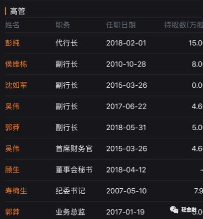 董事长为现年56岁的彭纯,行长为55岁的任德奇,副行长共有4位,分别是58岁的侯维栋、56岁的郭莽、54岁的沈如军、48岁的吴伟,同时吴伟兼任首席财务官,纪委书记是61岁的寿梅生,董事会秘书是顾生。