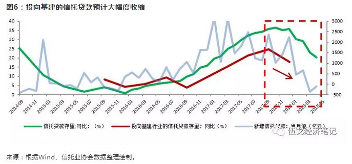 第一,信托贷款受到监管影响,对基建资金的贡献预计会有显著收缩。从过去信托业协会公布数据来看,信托贷款中大约有20%的资金流向了基建相关行业。而近期的《关于规范银信类业务的通知》明确指出,不得将信托资金违规投向地方政府融资平台等限制或禁止领域。今年年初以来,信托贷款存量同比逐步下滑,每月新增信托贷款更是已处于负数区间。按照这个下滑趋势,预计今年投向基建的信托资金收缩至8600亿,同比下滑15%。
