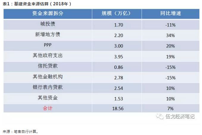 第三,除去信托贷款以外,其他通过金融机构的基建融资方式也同样受到严格约束。例如,资管新规严格控制了通道业务和期限错配;《打赢保险业防范化解重大风险攻坚战的总体方案》严禁保险公司违法违规向地方政府提供融资;《关于规范金融企业对地方政府和国有企业投融资行为有关问题的通知》严禁政策性、开发性金融机构为地方政府和国有企业提供各类违规融资。考虑到各类金融监管加强,并参照信托贷款的下滑速度,预计今年由其他金融机构提供的基建资金缩水至2.8万亿左右,同比下滑15%。综上,今年由各类金融机构提供的基建资金将从6.6万亿缩水至6.2万亿左右,同比下滑6%。