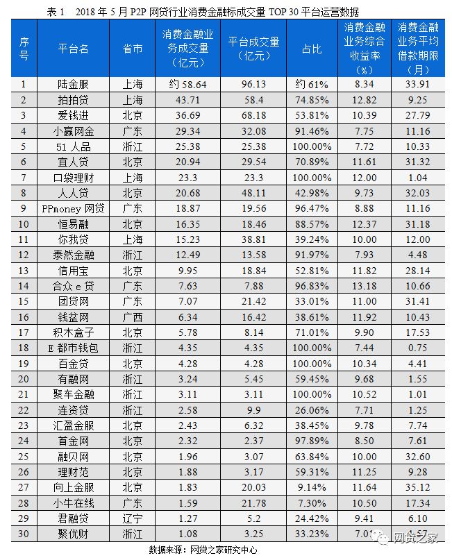 5月P2P平台消费金融TOP 30排行榜(名单)