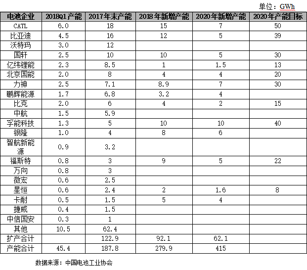 对主要电池企业目前公布的扩产计划进行统计梳理,2018-2020年每年增加动力电池产能分别为92.1GWh、73GWh和62.1GWh;到2020年动力电池总产能有望达到415GWh。