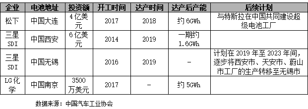 国外新能源汽车产业相关公司中,日韩系企业在中国的布局略早于欧美系公司。松下、LG、三星等日韩电池企业近年来陆续在中国建立电池工厂,目前LG、三星在中国建设的电池工厂已经投入阶段性运营,而松下在大连投资的电池工厂也将完成建设。韩系在等待2019年新能源补贴结束的心态明显,希望在没有补贴的市场环境中,形成规模产能与本土电池供应商展开新的竞争。
