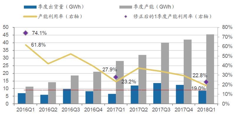 2018年1季度动力电池的季度产能为45.4GWh,出货量为8.8GWh,产能利用率为19.0%,考虑到一季度春节因素,对真实产能利用率进行一定的修正,修正后的1季度产能利用率=实际出货量*90(天)/75(天)/季度产能。修正后的产能利用率为22.8%,依然为2016年Q1以来的历史低位。