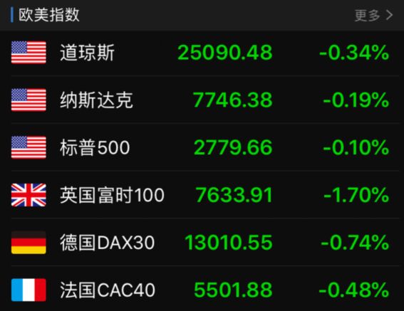 当地时间本周五,美股探底后小幅回升,收复过半跌幅,三大股指小幅收跌。截至收盘,标普500指数下跌0.11%,报2779.66点;纳斯达克指数跌幅0.19%,报7746.38点;道琼斯指数6月15日下跌84.83点,跌幅0.34%,报25090.48点。