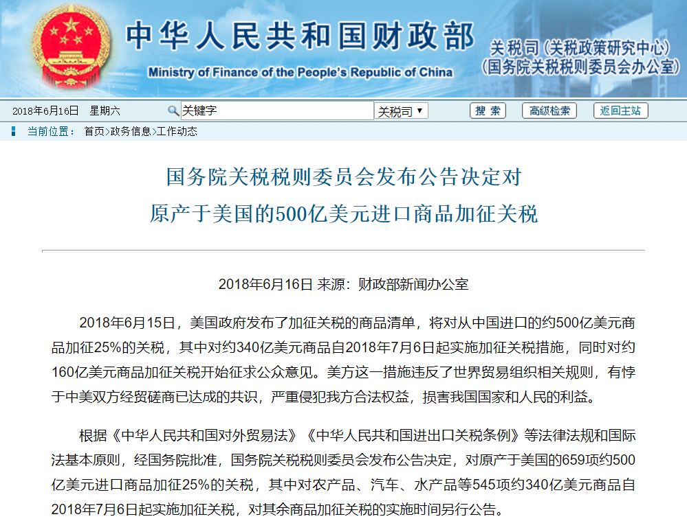 根据《中华人民共和国对外贸易法》《中华人民共和国进出口关税条例》等法律法规和国际法基本原则,经国务院批准,国务院关税税则委员会发布公告决定,对原产于美国的659项约500亿美元进口商品加征25%的关税,其中对农产品、汽车、水产品等545项约340亿美元商品自2018年7月6日起实施加征关税(见清单一),对其余商品(化工品、医疗设备、能源产品等114项商品,见清单二)加征关税的实施时间另行公告。