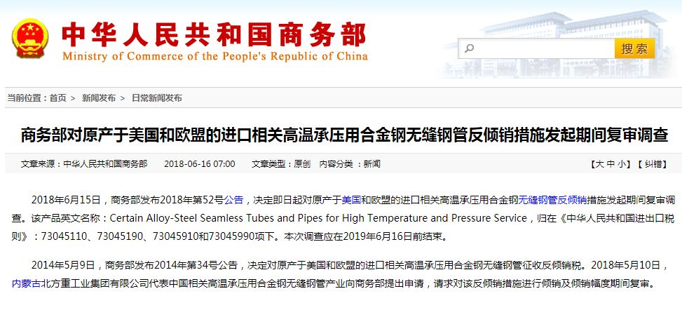 随后,商务部又发布了2018年第52号公告,决定即日起对原产于美国和欧盟的进口相关高温承压用合金钢无缝钢管反倾销措施发起期间复审调查。