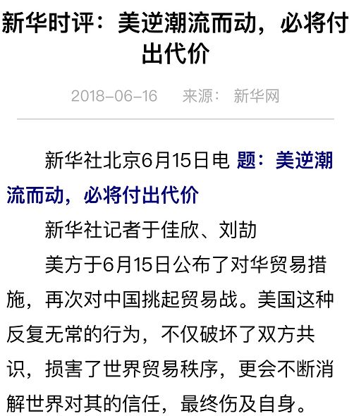 新华社称,美国这种反复无常的行为,不仅破坏了双方共识,损害了世界贸易秩序,更会不断消解世界对其的信任,最终伤及自身。贸易战挑起方往往不感受到疼痛就不会停止其无理行为。面对美国的单方面挑衅,我们必将坚决予以强硬回击。