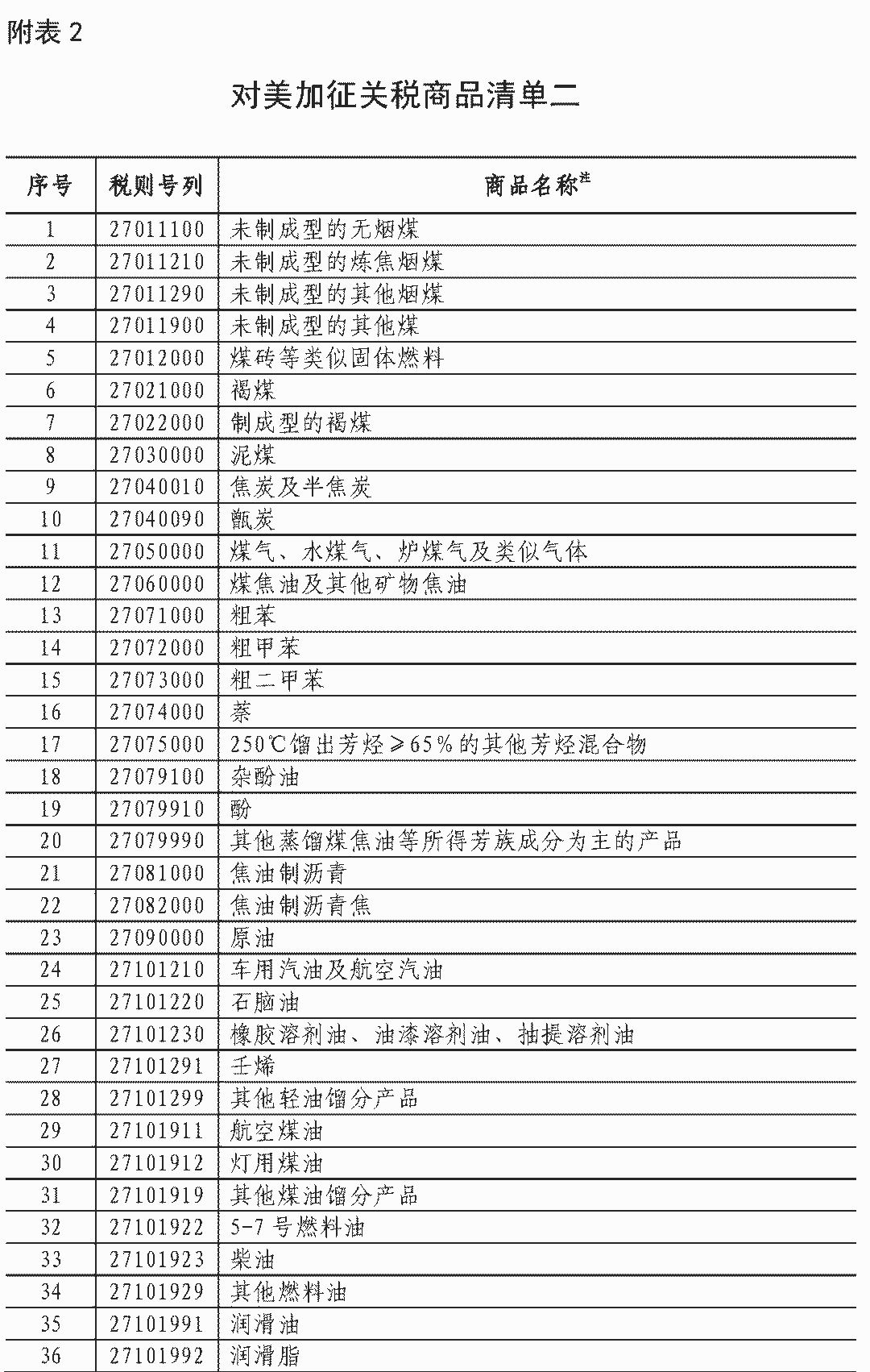 二、对化工品、医疗设备、能源产品等114项商品,加征关税实施时间另行公告,具体商品范围见附表2。