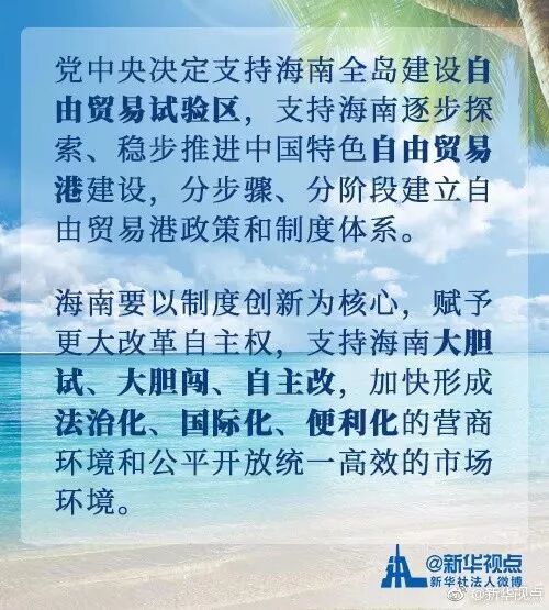 4月13日下午,国家主席习近平在庆祝海南建省办经济特区30周年大会上宣布,党中央决定支持海南全岛建设自由贸易试验区,支持海南逐步探索、稳步推进中国特色自由贸易港建设,分步骤、分阶段建立自由贸易港政策和制度体系。