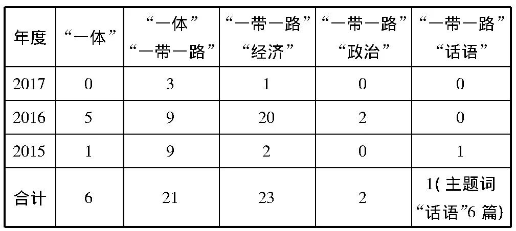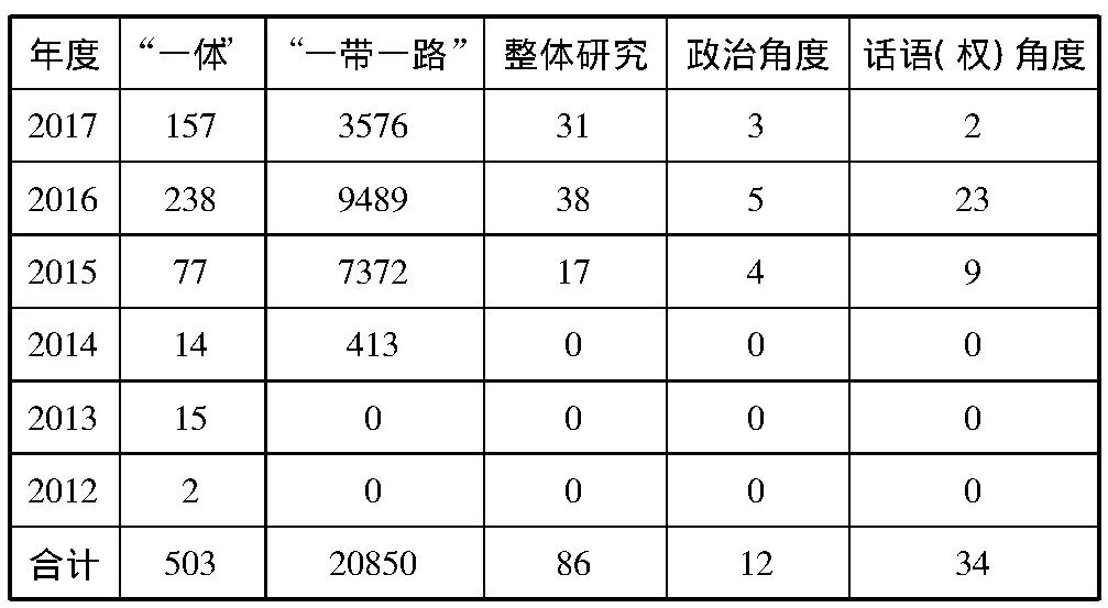 从现有网上资料考察, “一带一路”这个符号是在习近平提出“丝绸之路经济带”和“21世纪海上丝绸之路”基础上, 首次出现在2013年12月19日《人民日报》刊登的中国外交部部长王毅回答记者提问中, 距习主席提出“21世纪海上丝绸之路”仅两个半月。学术期刊相对滞后, 《求是》在王毅部长二次符号化后28天率先发表了“一带一路”论文, 位居期刊类榜首。截止2017年6月19日, 作为省市社科项目研究成果抢先发表的前三甲依次是云南、宁夏、内蒙。中国知网已收录的相关期刊论文共21451篇, 其中对“命运共同体”、“一带一路”整体研究只有86篇, 从政治角度研究仅有12篇, “一体”、“一带一路”话语 (权) 研究有34篇 (见表1) 。
