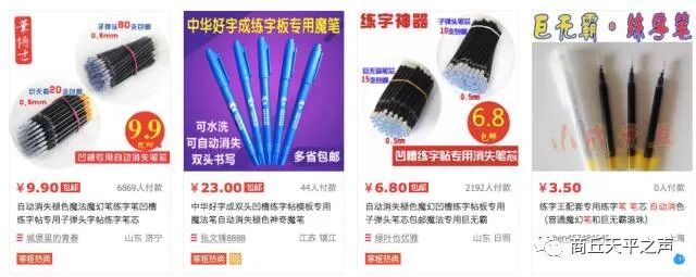“自动褪色魔术笔”外形与普通签字笔无异,只是采用了特殊墨水。该墨水书写出来的字迹也与普通签字笔没有任何差别。淘宝网上浏览发现,此笔以服装专用褪色笔、记号笔、自动消失笔、退色笔、气消笔、水溶笔等名称进行销售,售价一般在5毛钱到50元不等,销量甚好。