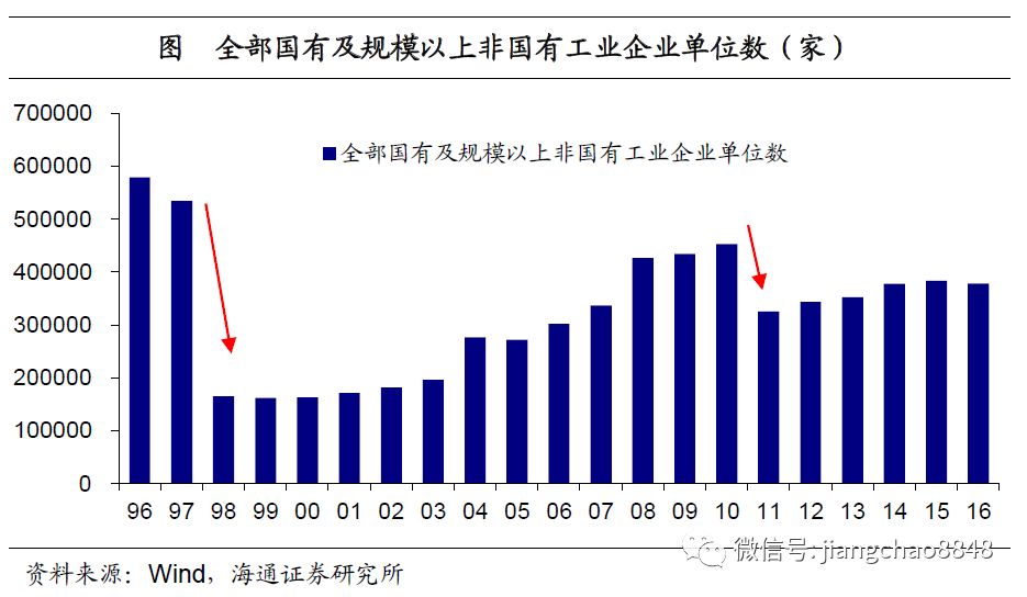 第一次是98年。98年以前工业统计范围为乡及乡以上独立核算工业企业,98年开始调整为规模以上工业企业。“规模以上”具体指主营业务收入在500万元以上的非国有企业和全国国有企业。也就是说,98年之前的统计包含了乡以上的规模以下企业,而未包含乡以下的规模以上企业,而98年之后的统计剔除了前者而包含了后者。统计范围的大幅调整使得符合条件的企业数量从97年的53.4万家大幅缩减至16.5万家,而基期数据的缺失也使得以利润总额计算得到的同比增速远高于可比口径下的增速。