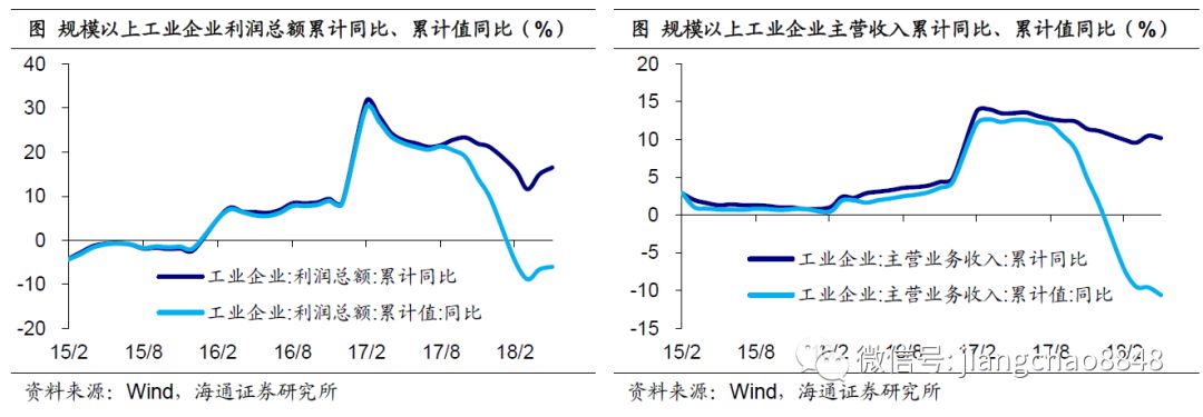 摘 要 累计同比≠累计值同比,工业利润怎么了? 去年4季度以来,统计局公布的规模以上工业企业利润总额累计同比增速整体保持高位,去年全年稳定在20%以上,今年略降至15%左右。与此同时,由工业企业利润总额累计值计算得到的同比增速却拐头向下,去年底已降至10%左右,今年更是下滑转负。同样出现背离的还有规模以上工业企业主营业务收入增速,可比口径增速仍稳定在10%,但计算得到的增速却降至-10%。 这种背离并非孤例,几乎是全行业的普遍现象。制造业最为明显,下游消费类行业、中游装备制造类行业,以及上游原材料加工类行业无一例外。公用事业行业情况相对较好,只出现微小偏差。 增速“背离”的实质:调口径,挤水分,营改增 规模以上工业企业利润总额累计同比和累计值同比背离,原因主要有三个: 一是马太效应显现,统计口径调整。回顾历史,“规模以上”范围共经历3次调整,而此前的3次背离皆与口径调整有关。17年4季度以来的“背离”与11年类似,都是统计口径缩小导致累计增速高于累计值增速。不同之处在于,11年是统计标准上调导致口径缩小,而本次“背离”缘于去产能政策导致传统工业行业内部强者恒强,弱者淘汰出局、不再被计入“规模以上”范围。 二是数据水分挤出,剔除重复统计。但马太效应下的统计口径调整并非“背离”的唯一原因。一方面,今年以来国有企业、A股非金融企业利润增速仍在20%以上,反映今年以来企业盈利确实在改善,只是幅度不及去年。另一方面,数据背离始于17年4季度,时间上明显晚于去产能政策落实。而17年4季度的关键变化在于,统计局加强了数据质量管理,剔除跨地区、跨行业重复统计数据。作为明显的证据,去年4季度以来,限额以上零售增速也出现明显“背离”。 三是营改增影响显现,非工业剥离。利润总额不仅包含工业生产活动所产生的收益(即主营活动利润),还包括营业外净收入、投资收益和其他业务利润。实施“营改增”政策前,部分工业企业将本应缴纳营业税的非工业生产经营活动纳入本企业的财务核算,用以抵扣销项税。但在“营改增”政策实施后,服务业企业改交增值税且税率较低,工业企业逐步将内部非工业生产经营活动剥离,转向服务业,这同样也使工业企业营收有所下降。 工业利润回落难免,制造业投资偏弱 未来工业利润增速回落或在所难免。宏观层面,从“社会融资—名义GDP—工业利润”的传导看,18年5月社融增速已降至10.3%,预示18年末GDP名义增速或降至8%左右,对应工业利润增速重回零增长。微观层面,从“收入—利润率—利润”的传导看,地产投资和出口增速的放缓将拖累工业收入增长,而工业品价格涨幅趋缓将令高企的利润率难以为继。 从利润到投资传导不畅,制造业投资偏弱。企业盈利决定私人部门投资意愿,融资环境决定投资能力,两者共同决定了制造业投资。以往工业利润领先制造业投资一年左右。但本轮盈利改善向制造业投资的传导明显存在阻碍——利润改善主要由上游原材料类行业贡献,但却是去产能的主要行业,其产能扩张受到政策约束;中下游行业利润改善幅度有限,却又面临需求放缓、原材料成本高企的双重约束,产能扩张意愿不足,这使得设备投资周期迟迟没有启动。因而盈利改善向投资回升的传导并不顺畅,下半年制造业投资或依然偏慢。