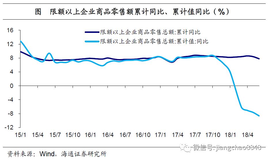 统计数据去水分,剔除重复统计。那么17年4季度究竟发生了什么呢?17年以来,统计局对规模以上工业企业统计数据进行了执法检查。今年6月,全国人大常委会副委员长王东明在十三届全国人大常委会第三次会议上做了报告,指出“2017年以来,国家统计局根据举报线索核查数据异常的2051家企业和2942个固定资产投资项目,有1195家企业、2775个投资单位的统计数据存在编造、虚报”。而根据6月底统计局的说明,从去年4季度开始,统计局加强了数据质量管理,剔除跨地区、跨行业重复统计数据。我们有理由相信,这一调整是真实可信的,并且调整并不仅限于工业、投资领域,也包含消费领域——去年4季度以来,限额以上商品零售数据也同样发生显著分化。