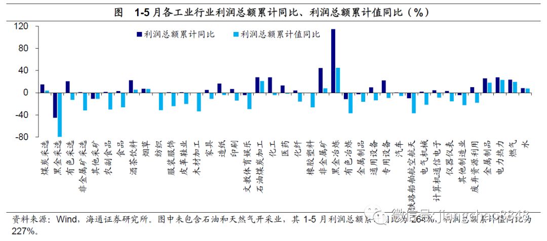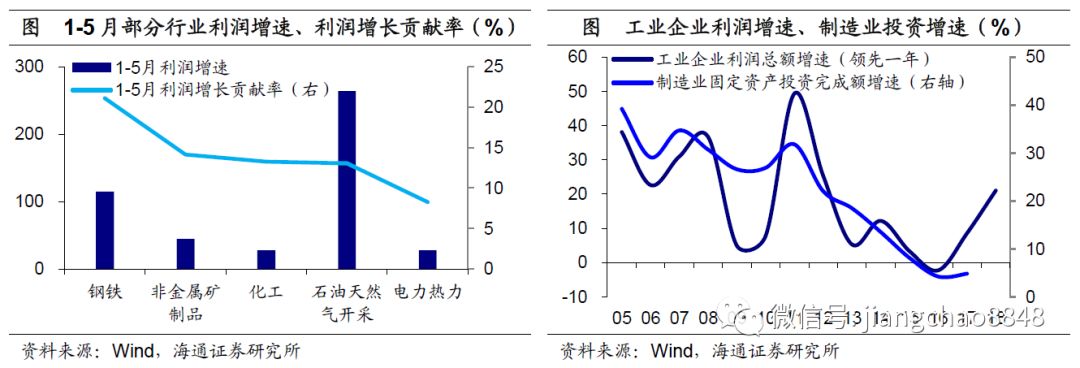 一方面,工业利润改善主要由上游原材料类行业贡献。本轮工业利润的改善,主要由上游行业所贡献。以今年1-5月为例,钢铁、水泥玻璃、化工、石油天然气开采、电力热力等五个行业对工业利润增长的贡献率高达70%。但上游行业恰恰是产能过剩重灾区,去产能带来企业资产负债表的修复,但去杠杆背景下上游行业资产负债表无法扩张。