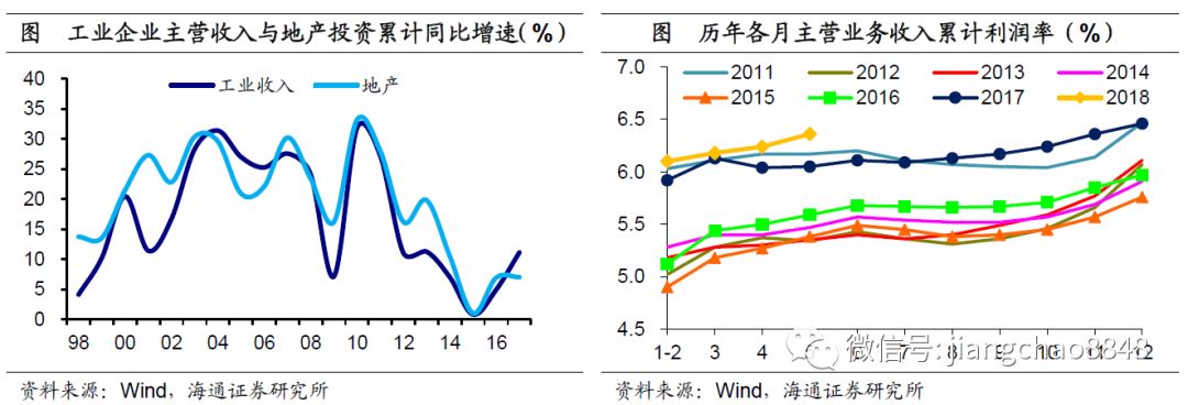 微观层面,地产投资下滑、工业价格涨幅趋缓将带动工业企业利润增速下行。本轮企业盈利改善,量的方面主要缘于需求端地产投资和出口双双回升,拉动工业需求;价的方面主要缘于工业工业品价格上涨,而成本费用下降,令工业企业利润率迭创新高。然而,去年4季度以来地产销售几乎零增长,意味着未来地产投资增速面临下行压力,而去产能接近尾声,意味着下半年工业品价格涨幅将趋于回落。量价两方面支撑双双转弱,工业利润势必面临下行压力。