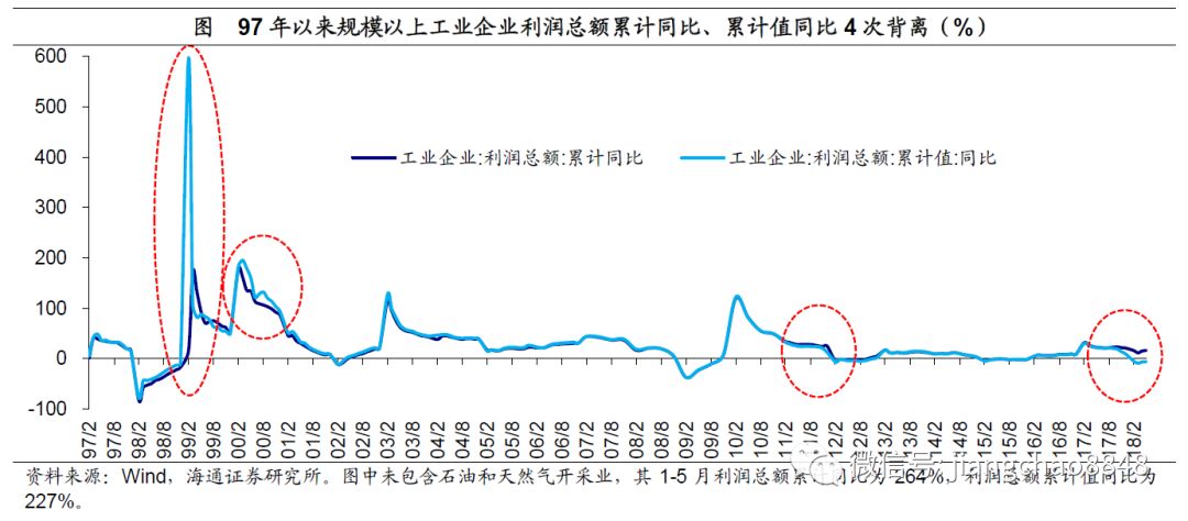 人为调高数据?并不可信!工业利润数据到底怎么了?目前一种较为流行的解释是,因为真实数据(累计值的同比增速)太低,所以人为调高了公布数据(累计同比增速)。这一解释存在明显的误导。统计局自96年开始公布工业企业利润总额及其增速数据,历史上,利润总额累计同比和利润总额累计值同比一共出现4次明显的背离,其中98年、00年都是后者高于前者,11年、18年都是前者高于后者,“人为调高数据”的说法很难解释前两次背离。
