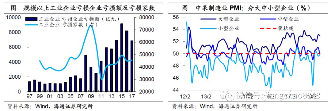 16、17年去产能政策发力,工业产能过剩问题得到很大缓解。而去产能,不仅表现为固定资产投资增速的放缓、产能利用率的上升,也表现为亏损企业的出清。在行业整体收缩的大背景下,大企业的规模优势和兼并收购令强者恒强,中小企业表现则每况愈下,即“马太效应”。而虽然去产能令僵尸企业破产清算,但其中越来越多的企业并不符合“规模以上”的标准,这使得在去产能政策发力的16、17年,规模以上工业企业亏损额、亏损家数均较15年不升反降,这也正是统计学中的“生存偏差”现象。事实上,上一轮98年的去产能也同样出现了类似现象。
