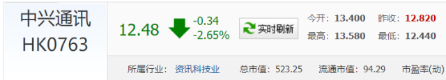 截至下午15:00,中兴通讯A股上涨2.60%,报13.80,中兴通讯H股下跌0.34%、报12.48。