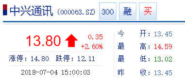 7月4日,中兴通讯AH股开盘大涨,上午10点27,中兴通讯A、H股分别上涨4.76%、2.03%。