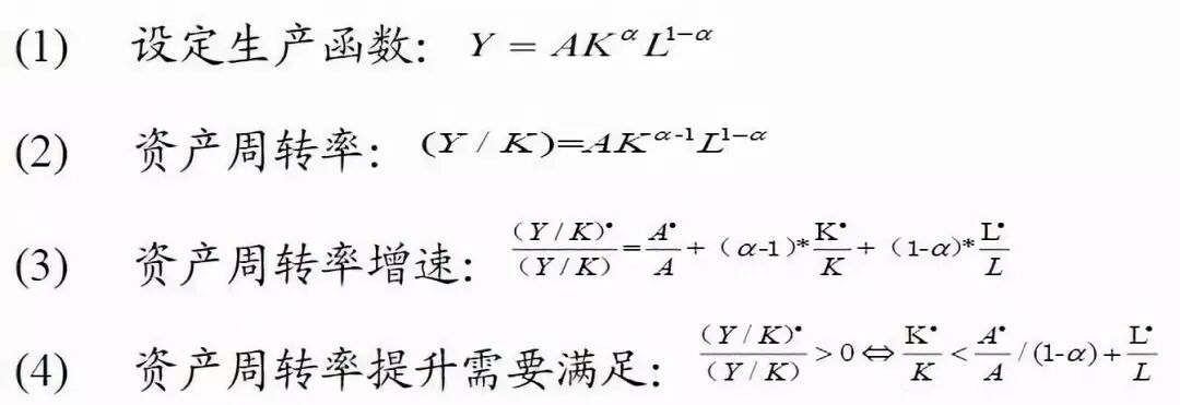 从更长的周期来看,资产周转率或产能利用率的长期均衡水平可能出现改变,其中存在一些更基本的经济含义。 如果把经济总量的生产函数处理成柯布-道格拉斯生产函数,在经济处于长期均衡状态的条件下,就可以计算出资产周转率的数学表达以及资产周转率变化的条件和方向。过程如下:
